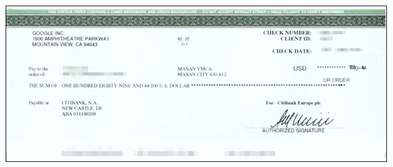 결제받는 수단 두 번째 방법은 '수표로 받기'입니다. '수표로 받기'를 선택하면 계좌등록을 할 필요가 없습니다. 이런 경우 광고 수익이 발행하게 되면 구글에서 수표를 우편으로 발송합니다.