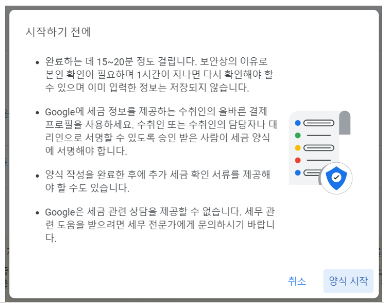 세금정보 추가를 클릭하면 양식 시작 팝업창이 뜹니다. 팝업창이 뜨면 양식 시작을 클릭해 줍니다.