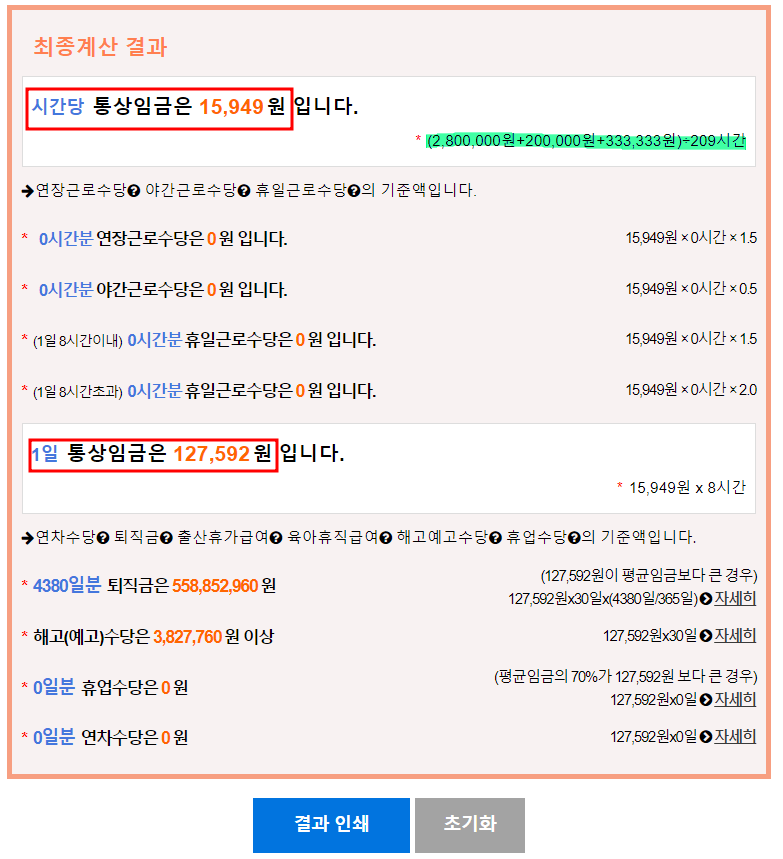위 그림과 같이 시간당 통상임금은 15,949원이 계산됐습니다. 일 통상임금은 8시간 기준으로 127,592원이 됩니다. 계산법은 어렵지 않습니다. 월 기본급 + 월 고정 수당 + 월 상여금을 더하고 209시간으로 나누면 됩니다.
